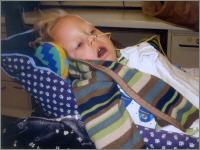 Bernhard-Sebastian Schmid wurde im Jahr 2000 als gesundes, aufgewecktes und fröhliches Kind geboren. Im Sommer 2003 bekam er eine Sommergrippe und wurde mit Verdacht auf Fieberkrampf ins Haunersche Kinderspital nach München eingewiesen. Nach einem schweren epileptischen Anfall mußte er beatmet werden und lag insgesamt vier Monate auf der Intensivstation. Im Wachkomazustand wurde Bernhard dann nach Vogtareuth zur Reha verlegt. Seit Mai 2004 wird er nun von uns Eltern mit Hilfe eines Pflegedienstes zuhause gepflegt. Er hat durch den langen Krampfanfall (Status Epi über 2,5 Monate) einen schweren Hirnschaden erlitten. Bernhard ist heute sehr warscheinlich blind, wird über eine Magensonde ernährt (er kann nicht schlucken und muß deshalb auch immer wieder abgesaugt werden) und leidet unter cerebralen Atemstillständen. Allerdings wacht Bernhard langsam auf. Er nimmt seine Umwelt immer mehr wahr. Bernhard reagiert sehr positiv auf alle Arten von Musiktherapie, besonders in der Klangwiege kann er sich vollkommen entspannen. Bernhard findet langsam wieder Vertrauen zu seiner Umwelt und läßt jetzt auch wieder Berührungen zu. Zehn Monate Krankenhaus haben ihm sehr zugesetzt. |