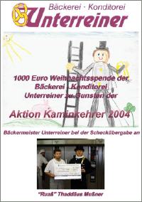 Am 5. Dezember übergab Bäckermeister Ludwig Unterreiner einen Scheck von 1000 Euro an den Organisator der Aktion Kaminkehrer 2004, "Ruaß" Thaddäus Mußner. Bäckermeister Unterreiner hofft auf das Verständnis der Kunden, dass es zu Weihnachten dieses Mal keine Werbegeschenke gibt.
