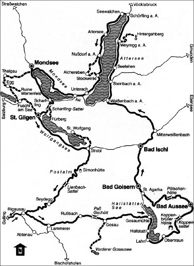 Die Tour beginnt in Freilassing mit der Fahrt über Golling nach Rigausau - Lammerer - Paß Gschütt (969 m) - Gosau - Gosaumühle - Hallstatt - Lahn - Obertraun - Koppensattel (690 m) - Bad Aussee - Pötschenhöhe (893 m) - St. Agatha - Bad Goisern - Bad Ischl - Mitterweißenbach - Weißenbach am Attersee - Steinbach a. A. - Seeleiten - Weyregg a. A. - Schörfling a. A. - Attersee - Nußdorf a. A. - Stockwinkel a. A. - Unterach a. A. - Au - Mondsee (493 m) - Scharfling - Scharflingsattel (604 m) - St. Gilgen - Strobl - Postalm (1284 m) - Lienbach-Sattel (1304 m) - Seydegg - Rigausau |