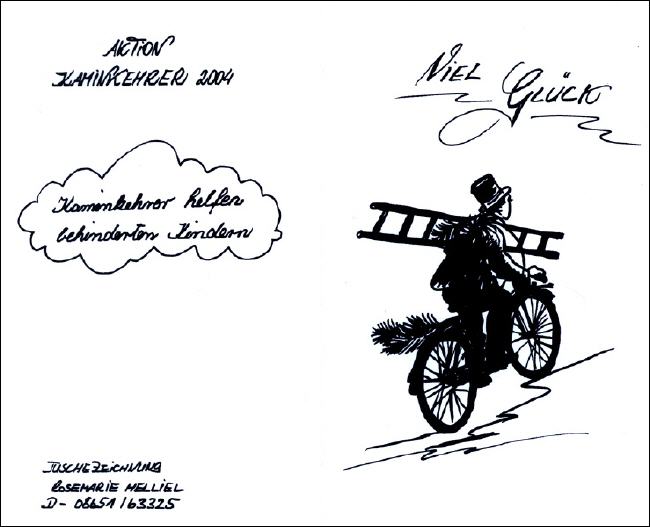 Ab sofort beteiligt sich auch die Pidinger Rosemarie Helliel mit künstlerisch gestalteten Grußkarten und gravierten Weißbiergläsern an der Aktion Kaminkehrer 2004. Die Materialien für die Grußkarten und auch die Weißbiergläser wurden jeweils von einer Firma gespendet. Aus diesem Grund kann der gesamte Erlös aus dem Verkauf der Aktion Kaminkehrer 2004 zu Gute kommen. |