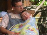Bernhard-Sebastian Schmid wurde im Jahr 2000 als gesundes, aufgewecktes und fröhliches Kind geboren. Im Sommer 2003 bekam er eine Sommergrippe und wurde mit Verdacht auf Fieberkrampf ins Haunersche Kinderspital nach München eingewiesen. Nach einem schweren epileptischen Anfall mußte er beatmet werden und lag insgesamt vier Monate auf der Intensivstation. Im Wachkomazustand wurde Bernhard dann nach Vogtareuth zur Reha verlegt. Seit Mai 2004 wird er nun von uns Eltern mit Hilfe eines Pflegedienstes zuhause gepflegt. Er hat durch den langen Krampfanfall (Status Epi über 2,5 Monate) einen schweren Hirnschaden erlitten. Bernhard ist heute sehr warscheinlich blind, wird über eine Magensonde ernährt (er kann nicht schlucken und muß deshalb auch immer wieder abgesaugt werden) und leidet unter cerebralen Atemstillständen. Allerdings wacht Bernhard langsam auf. Er nimmt seine Umwelt immer mehr wahr. Bernhard reagiert sehr positiv auf alle Arten von Musiktherapie, besonders in der Klangwiege kann er sich vollkommen entspannen. Bernhard findet langsam wieder Vertrauen zu seiner Umwelt und läßt jetzt auch wieder Berührungen zu. Zehn Monate Krankenhaus haben ihm sehr zugesetzt. |